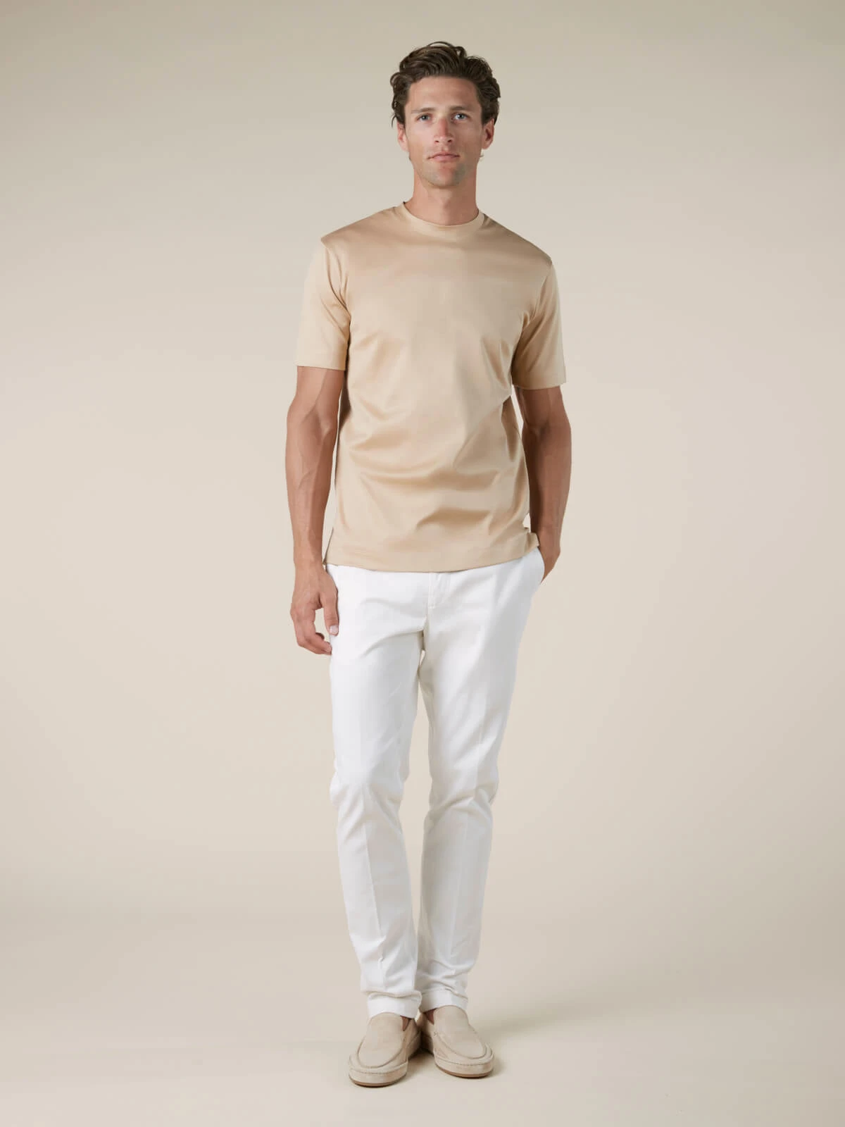 Short-sleeved T-shirt in super-soft interlock cotton. Designed with a classic crew neck collar, this T-shirt is knitted from fine Egyptian cotton, so it drapes effortlessly and comfortably. The extra-long staple and double mercerized cotton is characterized by outstanding softness and a silky feel that maintains with wear. Ideal for layering throughout the year.