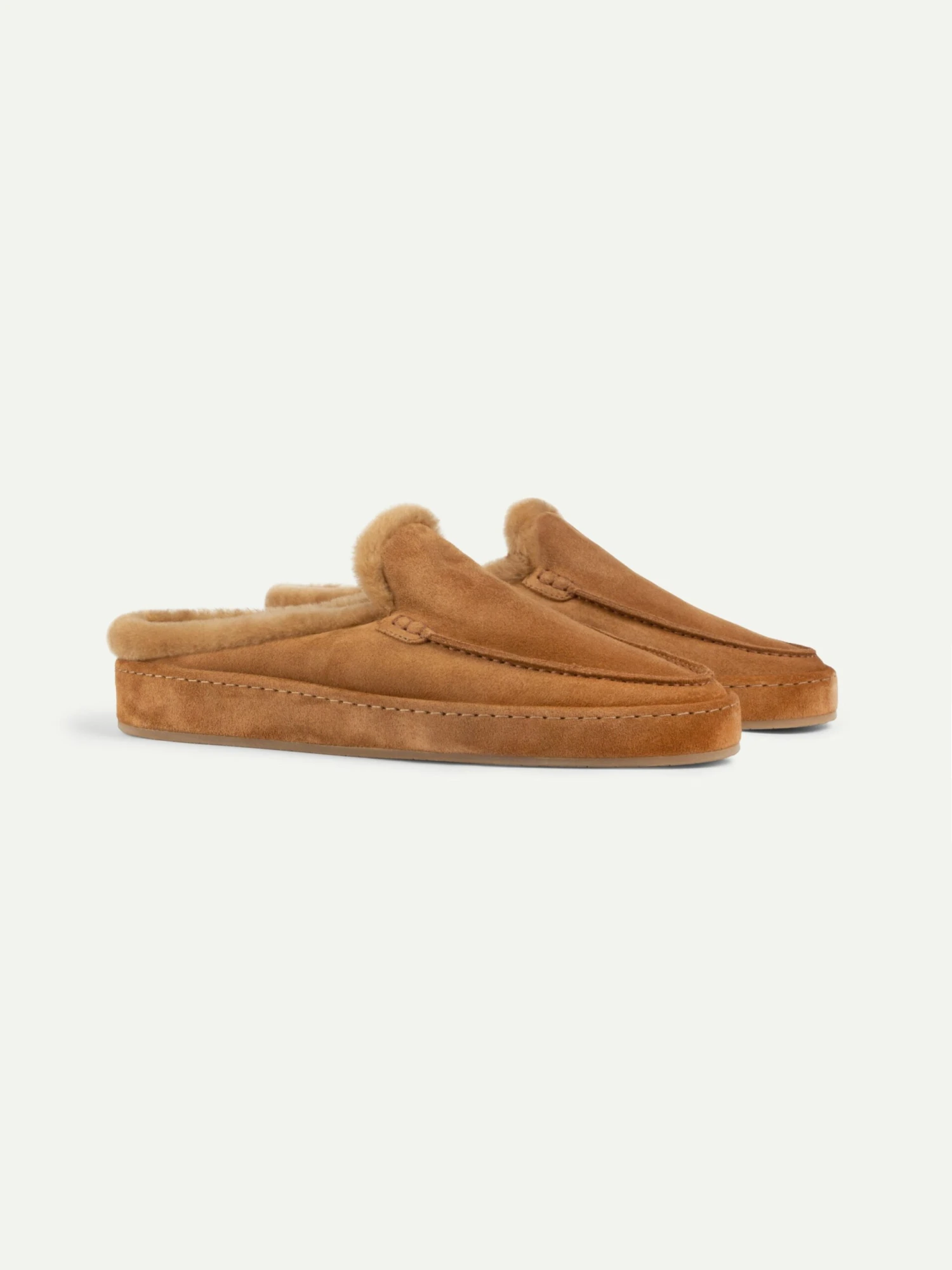 Our iconic Voyager Loafer is reimagined in a backless design, expertly crafted from supple suede and luxuriously lined with soft shearling. Its unique construction and stitching technique create a suede-trimmed sole that blends seamlessly with the silhouette. An ideal companion for the cold winter days at home.