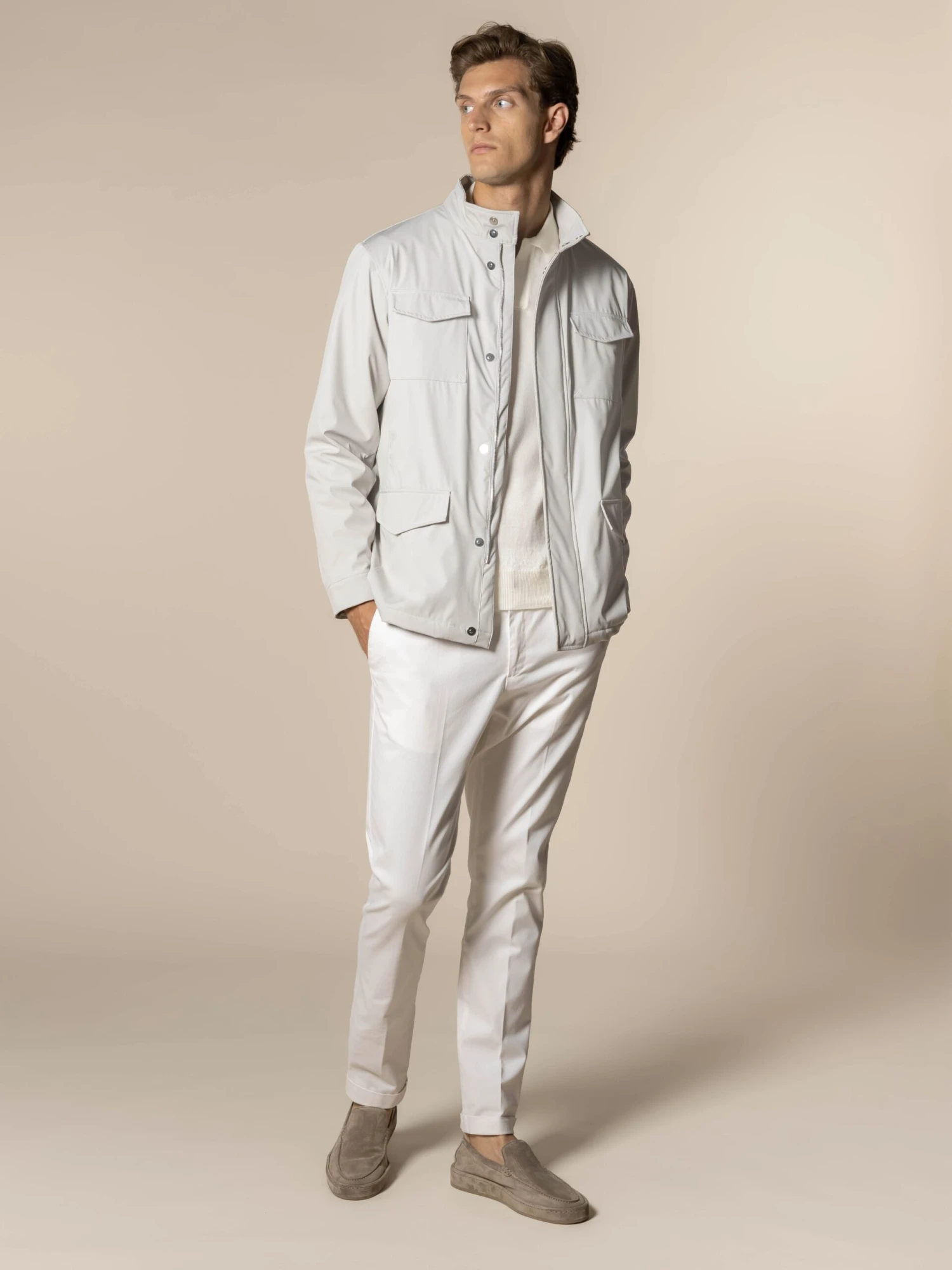 Blending innovation with timeless style, the Magnetic Field Jacket redefines outdoor elegance. Crafted from a soft, matte technical shell made from recycled fishing nets, it is both windproof and waterproof, offering protection with a refined touch. Inside, a cashmere-blend lining delivers lightweight comfort. Innovative magnetic closures provide a seamless, effortless wearing experience, while subtle padding maintains a sharp, streamlined silhouette. Signature Aurélien details — including the discreet embroidered logo at the back of the neck — add a final note of understated luxury. Infused with Mediterranean spirit, the Field Jacket is an essential symbol of sophisticated adventure.