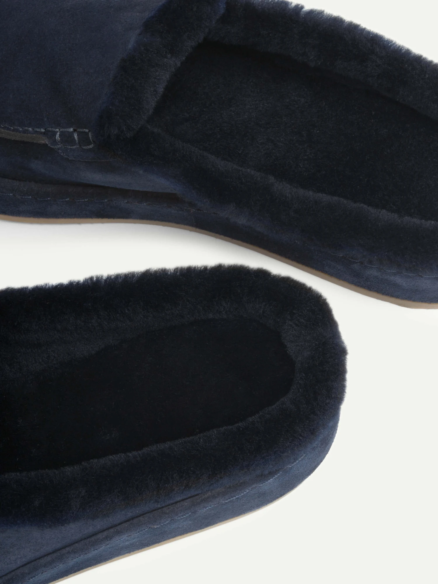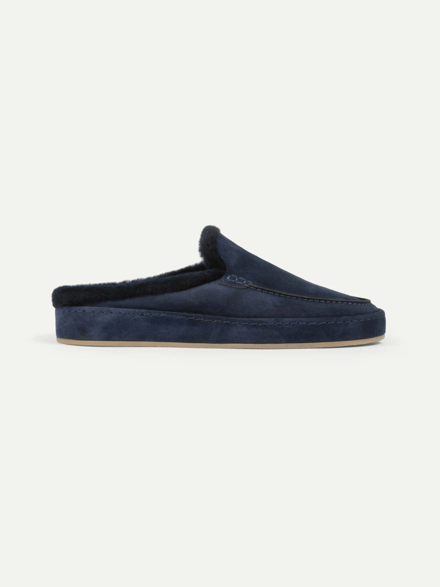 Our iconic Voyager Loafer is reimagined in a backless design, expertly crafted from supple suede and luxuriously lined with soft shearling. Its unique construction and stitching technique create a suede-trimmed sole that blends seamlessly with the silhouette. An ideal companion for the cold winter days at home.