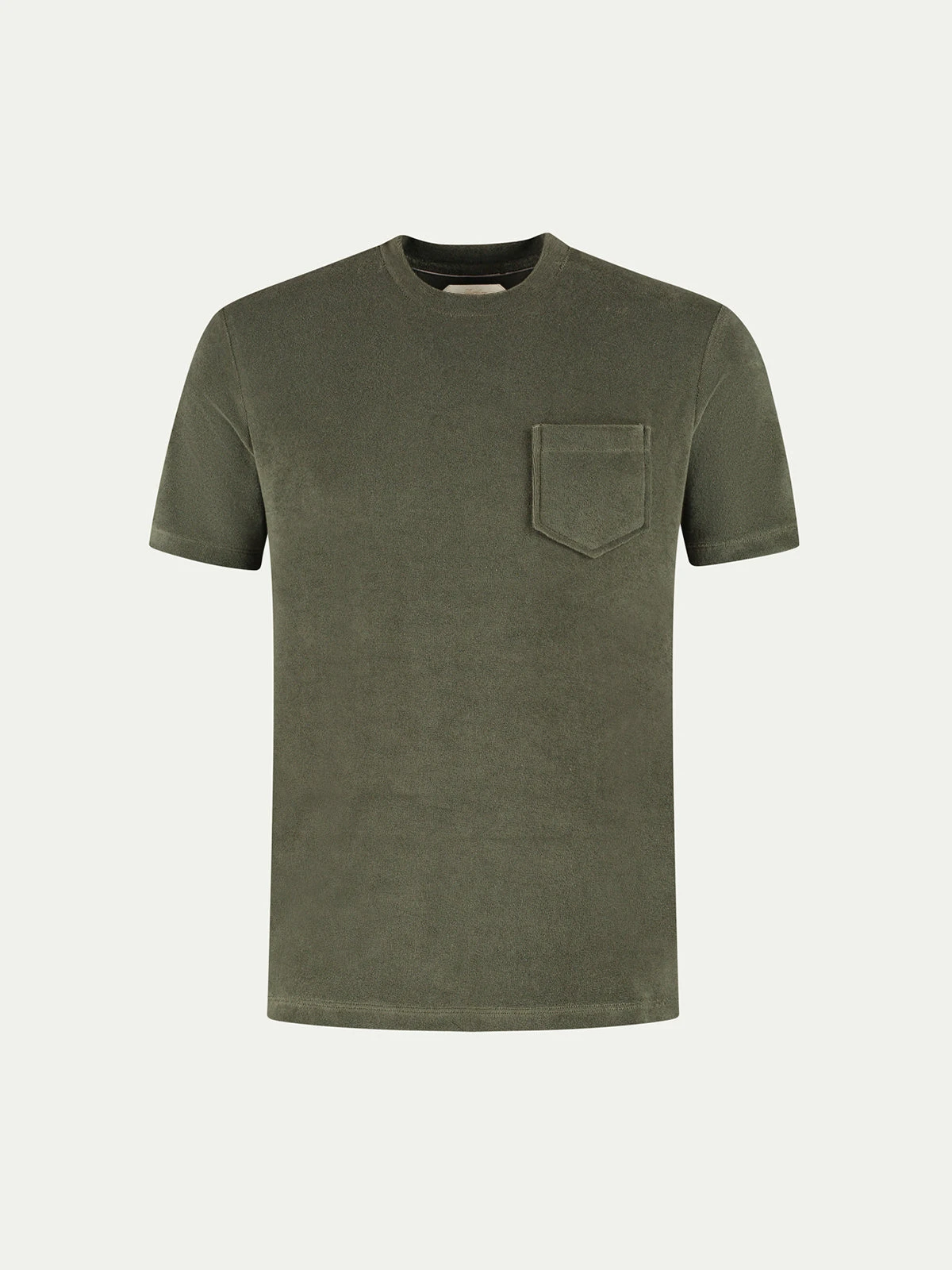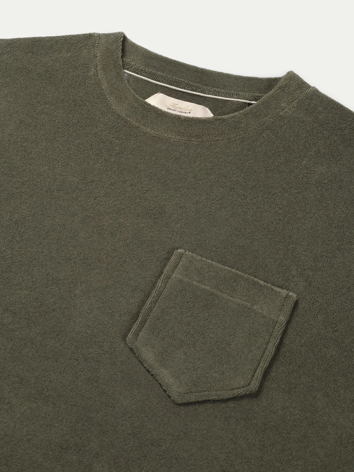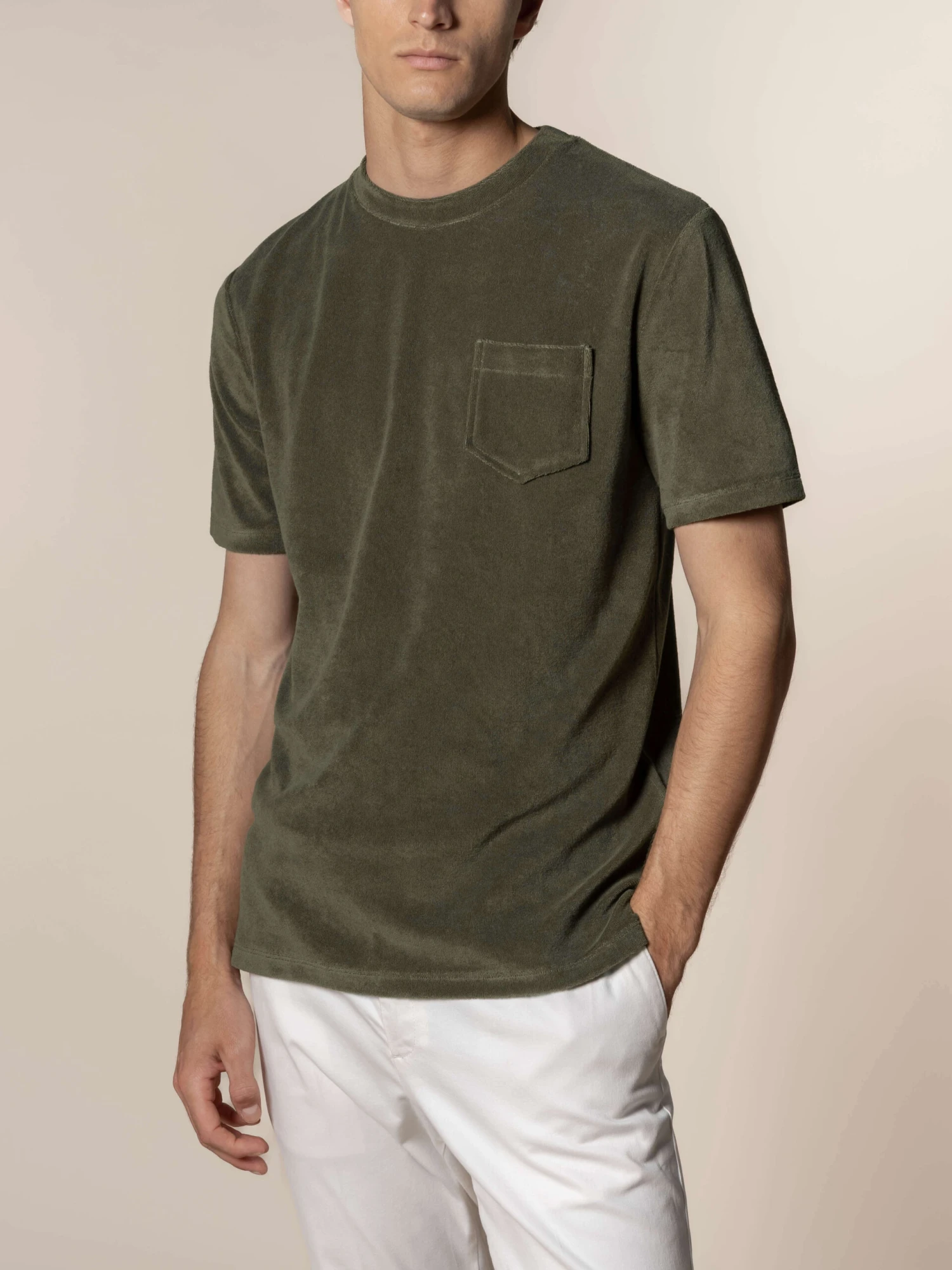 From the city to the sun lounger, this terry towelling T-shirt should be a year-round wardrobe staple. Cut from incredibly soft cotton-terry towelling fabric, this T-shirt is a holiday essential. With its timeless styling, the terry T-shirt is a classic piece that gets better with each wear. It features Aurélien’s signature gold satin trim inside the neckline, adding a subtle touch of luxury, and a distinctive chest pocket that speaks to the maison’s refined, practical aesthetic.
