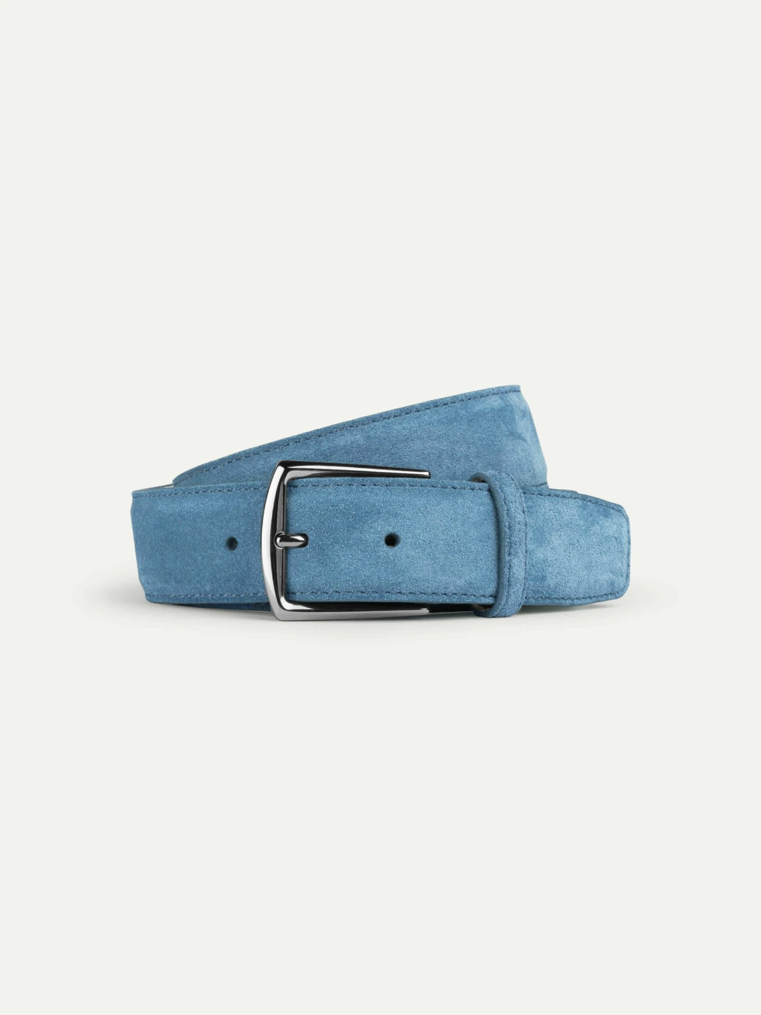 Highly supple belt made of Softey® suede and nubuck that teams clean lines with a polished gun metal buckle, making it a timeless and versatile addition to any man’s repertoire. Faultlessly crafted in Italy, it’s an equally sharp choice for light or dark trousers. Removable buckle to adjust the belt to perfect fit, one size fits all. Matches with the sapphire blue suede driving shoes, sneakers and loafers.